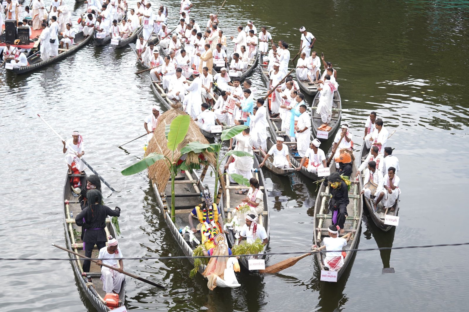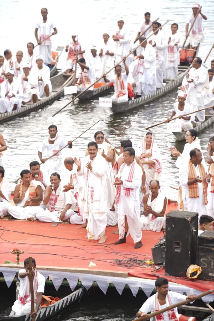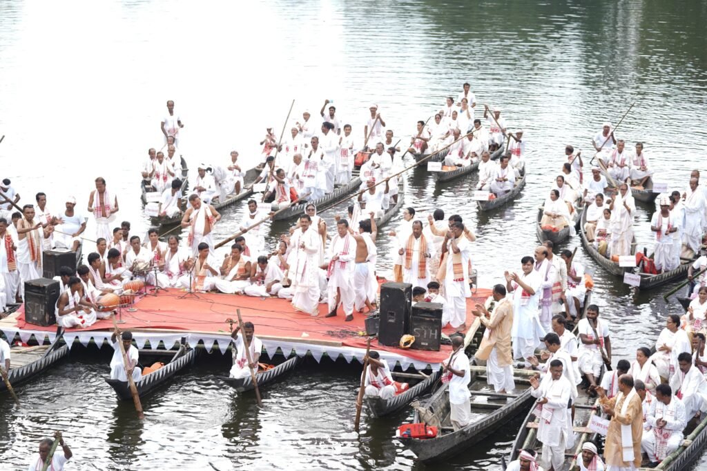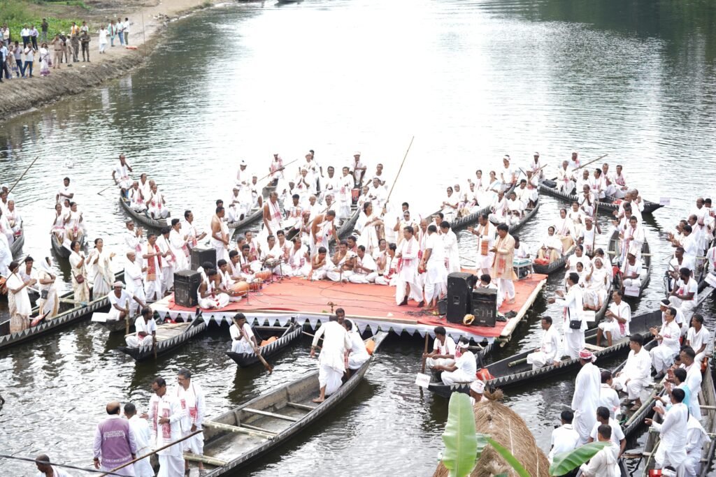 The event, conceptualised by Majuli MLA Bhuban Gam and organised by the Majuli district administration, took place on the second day of the Raas Mahotsav. The Tuni River, considered the lifeline of Majuli, came alive with devotional fervor as the boats carried participants engaged in Nam-Kirtan (chanting the Lord’s name).