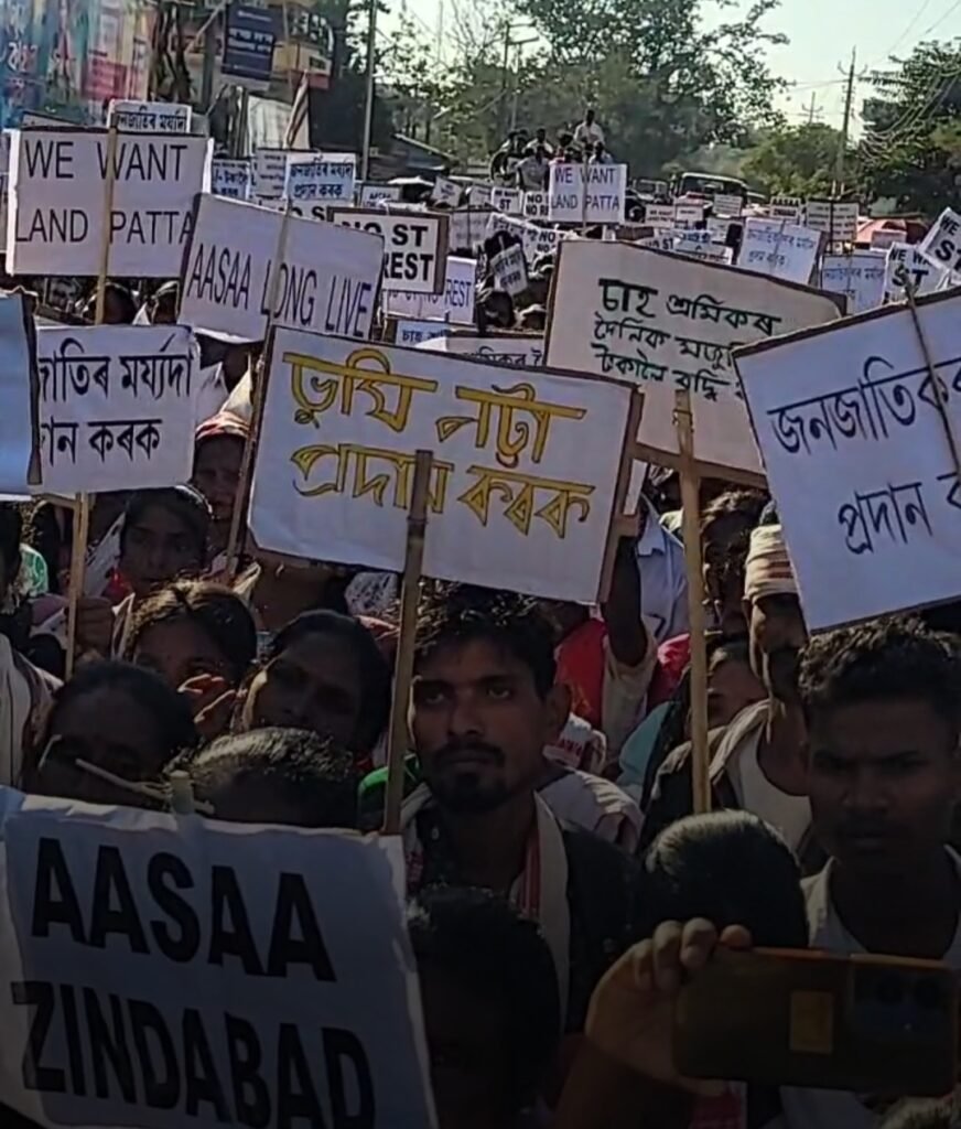 In a massive display of solidarity, hundreds of members of the Adivasi tea community staged a major protest in Sonari town, Charaideo district, on Thursday. Organised by the All Adivasi Students’ Association of Assam (AASAA), the demonstration brought the town to a standstill as participants voiced their long-pending demands for Scheduled Tribe (ST) status, land rights, and a significant wage increase.