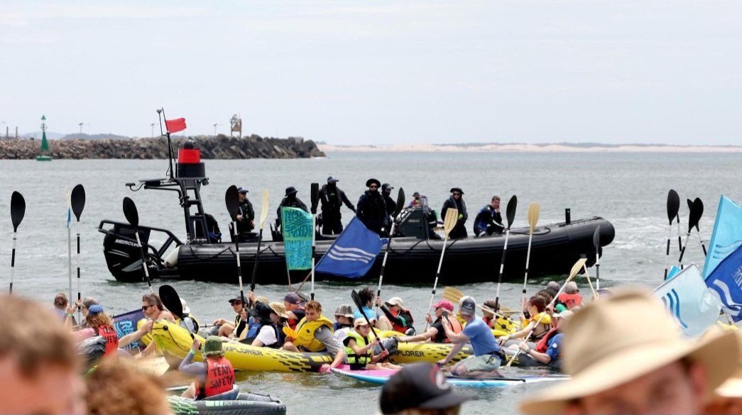 The activist group Rising Tide organised the demonstration, where hundreds of protestors paddled into the harbour’s main shipping channel to block coal exports. The Port of Newcastle, located 170 km north of Sydney, is the world’s largest coal export terminal.