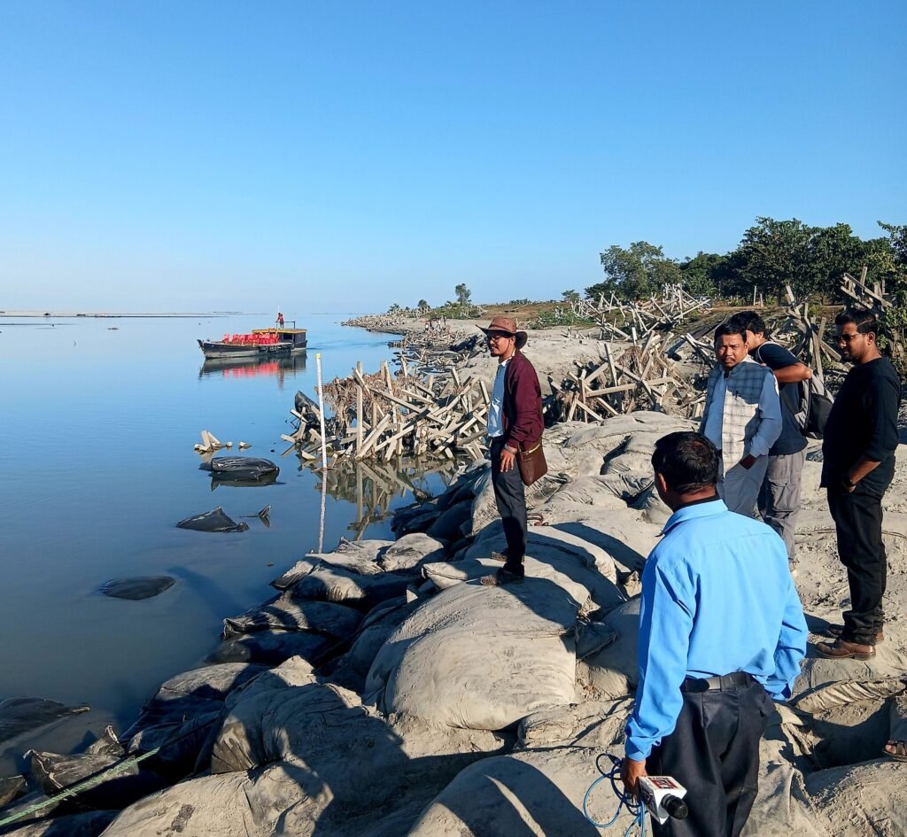 Water Resources Department officials briefed the visiting team on multiple simultaneous projects being executed along an 800-metre erosion-affected stretch in the upstream areas of Nagaghuli. The protective strategy employs advanced C-type geo bag screening technology alongside traditional RCC porcupine structures to combat the river’s aggressive erosive forces.