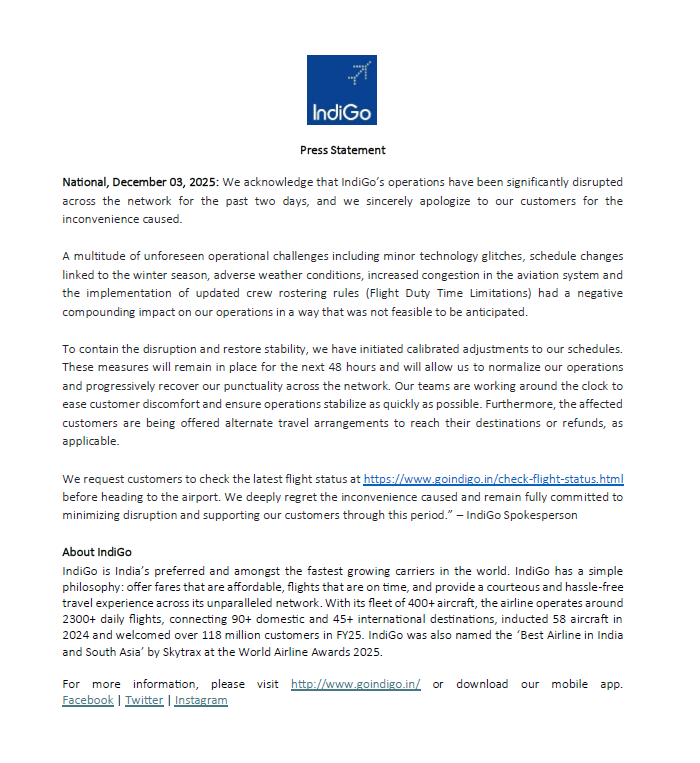 In a statement addressing the crisis, IndiGo acknowledged the widespread disruption, attributing it to a “multitude of unforeseen operational challenges including minor technology glitches, schedule changes linked to the winter season… and the implementation of updated crew rostering rules.”