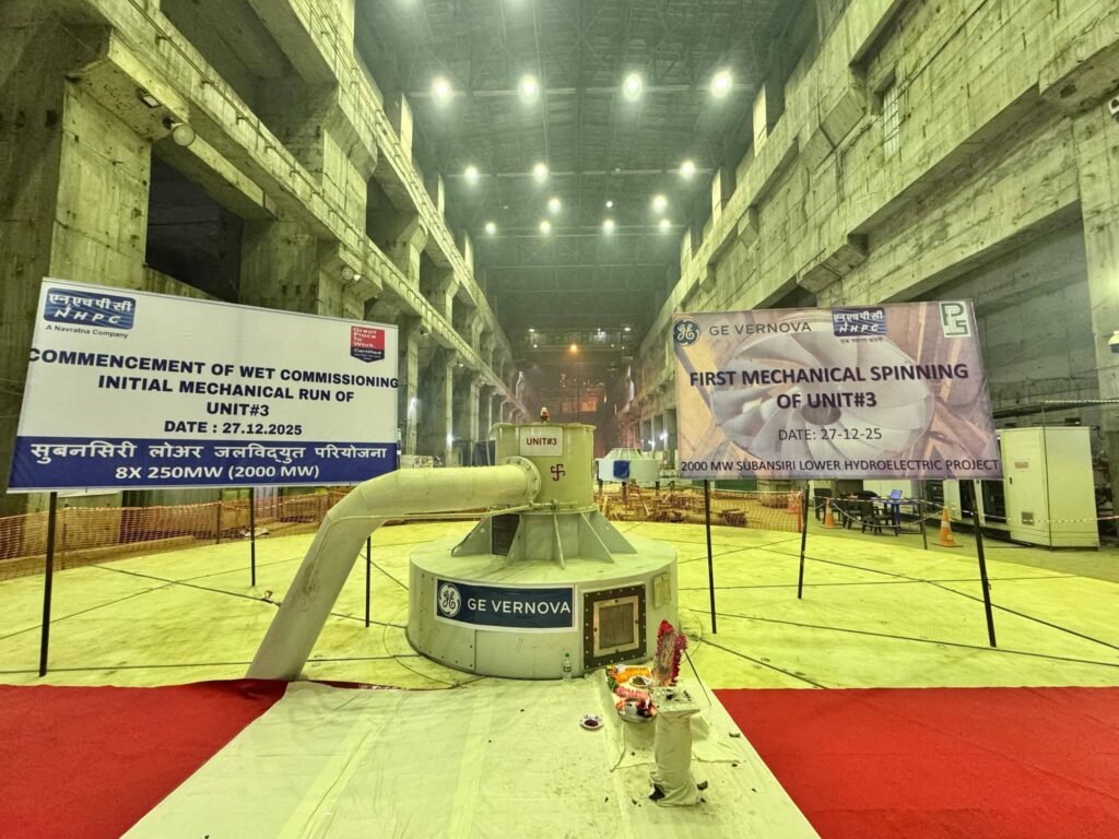 The National Hydroelectric Power Corporation Ltd (NHPC) officially commenced the wet commissioning of Unit–3 at the 2,000 MW Subansiri Lower Hydroelectric Project (SLHEP) on Saturday, (Dec 27). The milestone was marked by the successful mechanical run of the 250 MW machine, signaling the start of the synchronisation process for the third unit of what is set to become the nation’s largest hydropower installation.