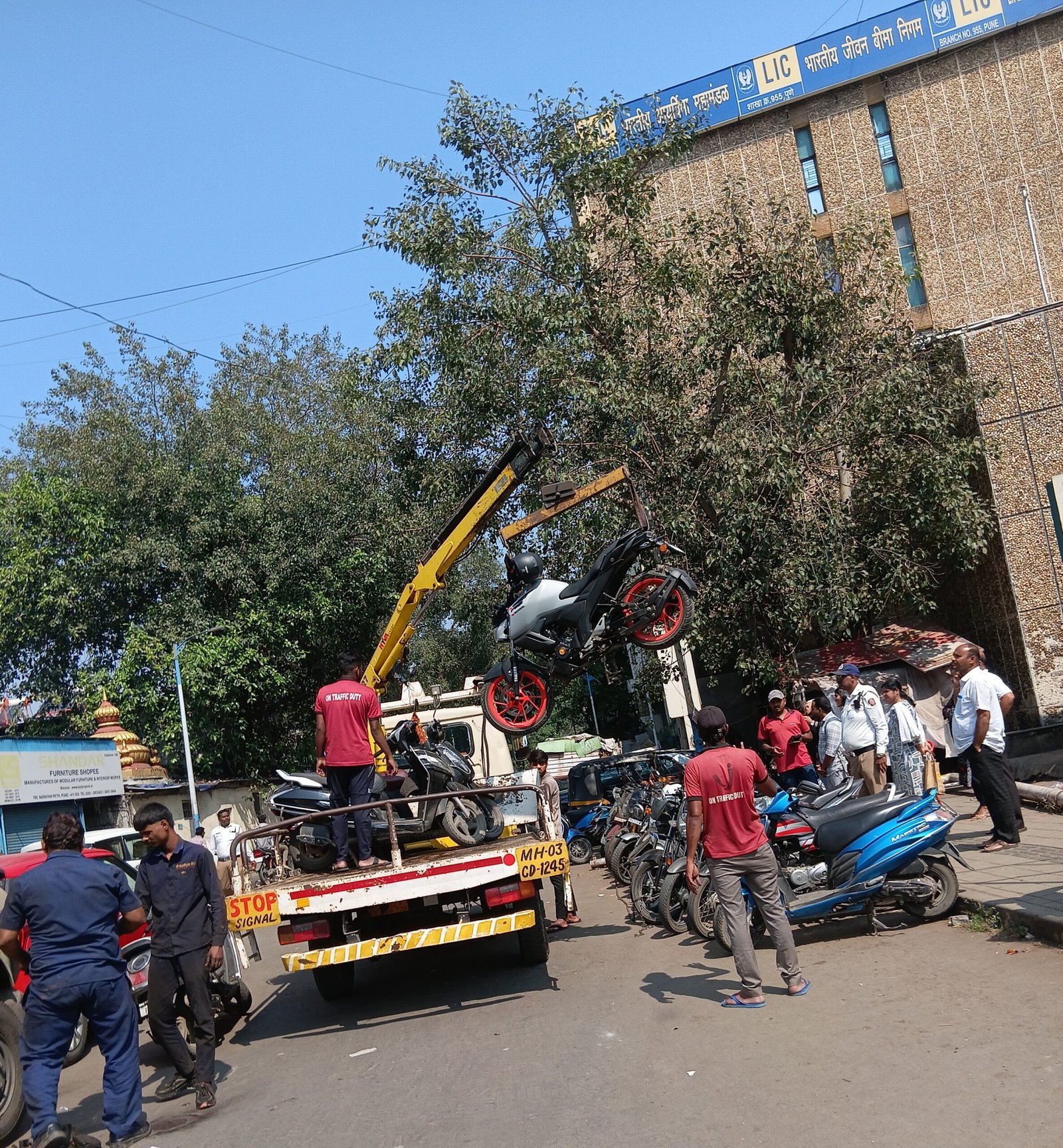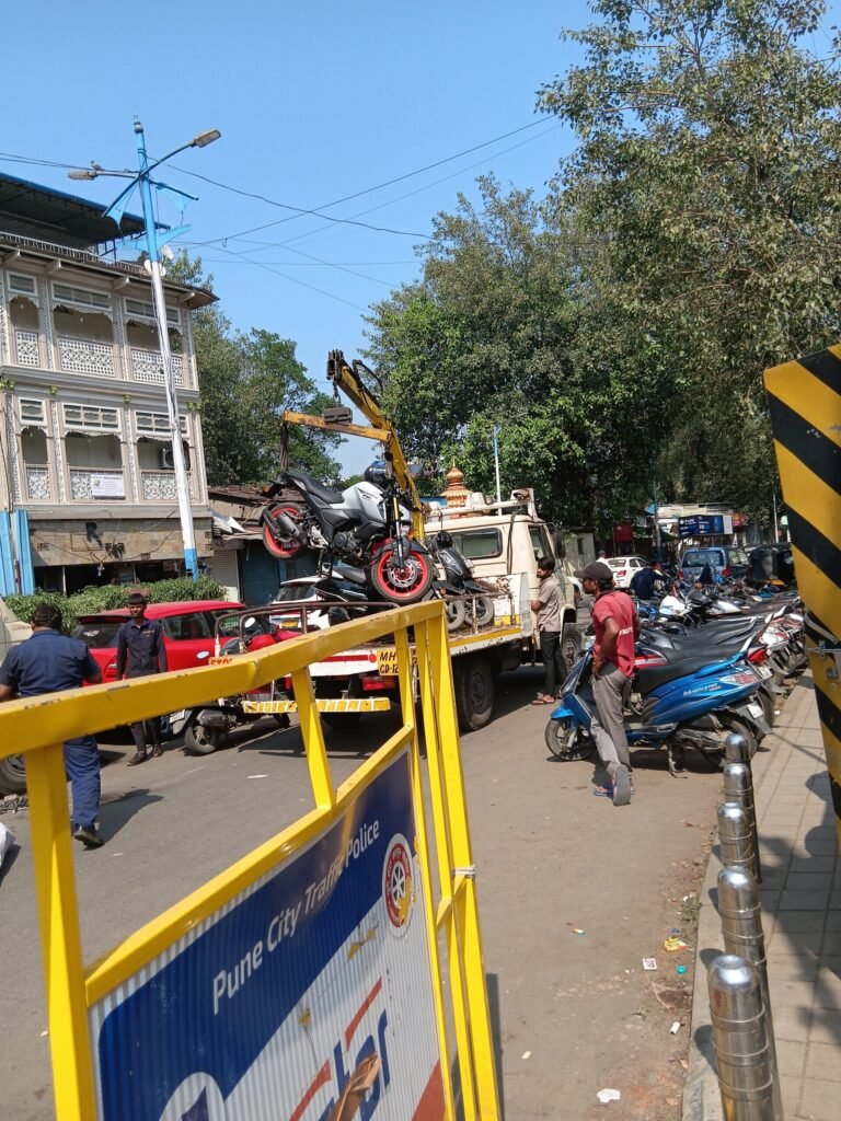 Traffic police personnel were deployed along various stretches of Laxmi Road during the operation, systematically identifying and removing vehicles parked in designated no-parking zones. Tow trucks were pressed into service to transport the impounded two-wheelers to the traffic police headquarters.