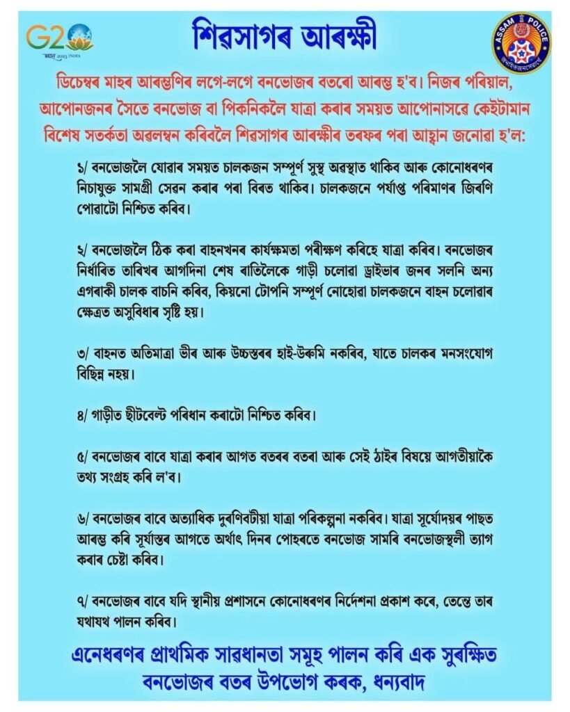 Sivasagar Police have also urged visitors to check weather forecasts, plan travel ahead of time, and avoid long-distance trips that might stretch drivers’ endurance. In addition, all groups are instructed to follow any additional advisories issued by local authorities.